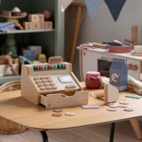 Rollenspiele wie „Einkaufen“ und „Lebensmittelladen“ sind lehrreich und machen Spaß. Die Sebra Kaufmannsladenkasse hilft Ihrem Kind, das Spiel realistisch zu gestalten, wenn es Spielnahrung, Teddybären und selbstgemalte Bilder verkauft. Den Bezahlvorgang zu spielen und die Funktion und den Wert von Geld zu verstehen, ist eine wichtige Erfahrung. Die Holzkasse verfügt über eine ausziehbare Schublade für die mitgelieferten Sebra Holzmünzen (Werte 1, 2 und 5), einen Zählrahmen mit 10 Kugeln, Druckknöpfe mit Zahlen (Plus (+), Komma (,) und „Total“), einen Scanner, zwei Kreditkarten, ein Kreditkartenlesegerät sowie eine Quittungsrolle aus Stoff.