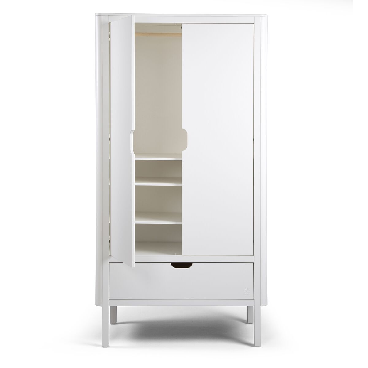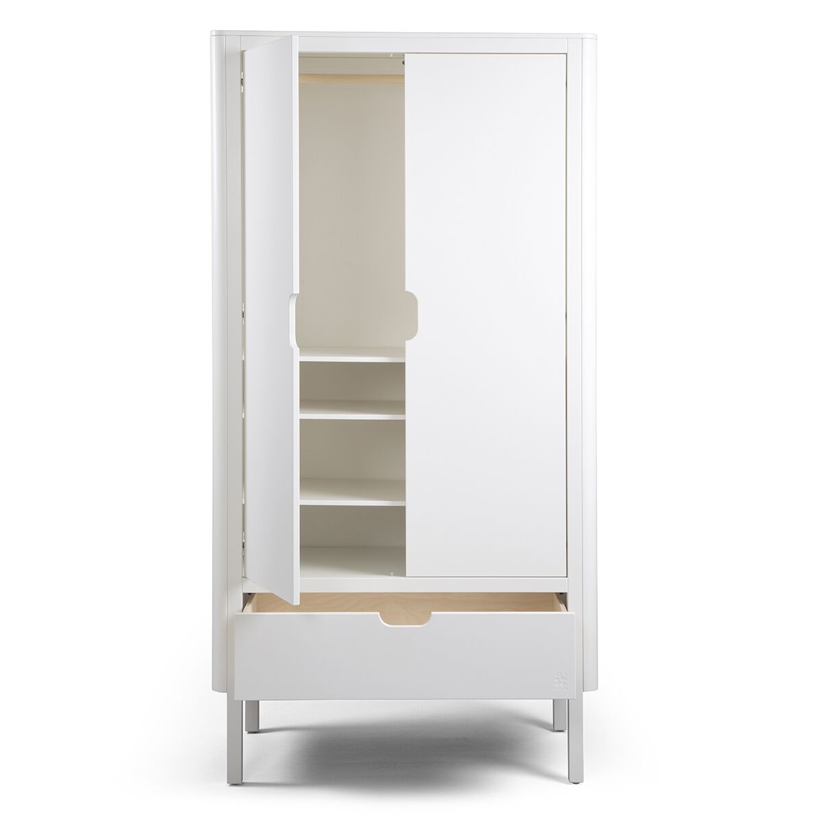 Die Fronten kommen mit geschnitzten Griffen an der Schublade des jeweils ein- oder zweitürigen Schranks. Durch sie und auch durch die abgerundeten Schrank-Ecken, ist die Sicherheit im Kinderzimmer gewährleistet. Es gibt keine scharfen Ecken und Kanten, an denen man sich stoßen könnte.