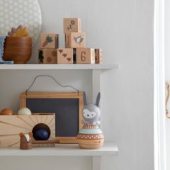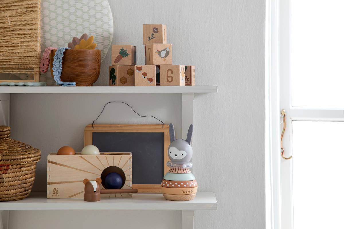 Lustige Sebra Klopfbank aus Holz mit drei bunten Kugeln und einem Hammer zum Spielen für die Kleinsten. Diese Hammerbox ist Teil der Woodland-Kollektion von Sebra.
