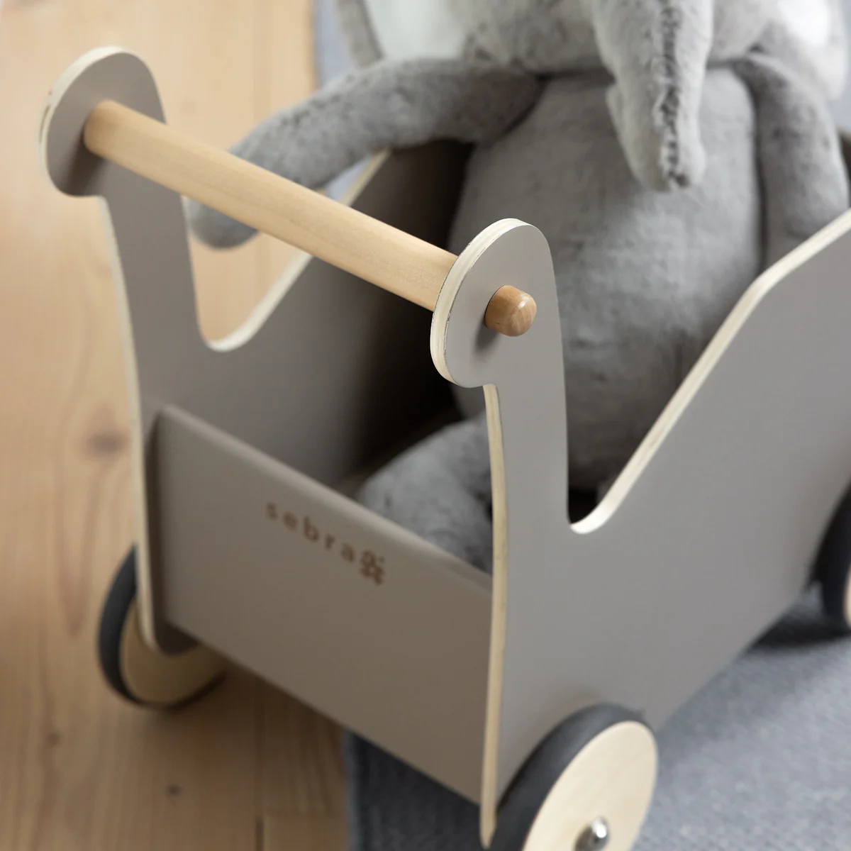 Der Sebra Lauflernwagen verfügt über abgerundete Ecken und einen hübschen kleinen Holzgriff aus Naturholz, an dem sich das Kind halten kann. Der Lauflernwagen ist mit 4 Holzrädern mit Gummikanten ausgestattet, die dafür sorgen, dass er geräuscharm ist, wenn er über den Boden gefahren wird.