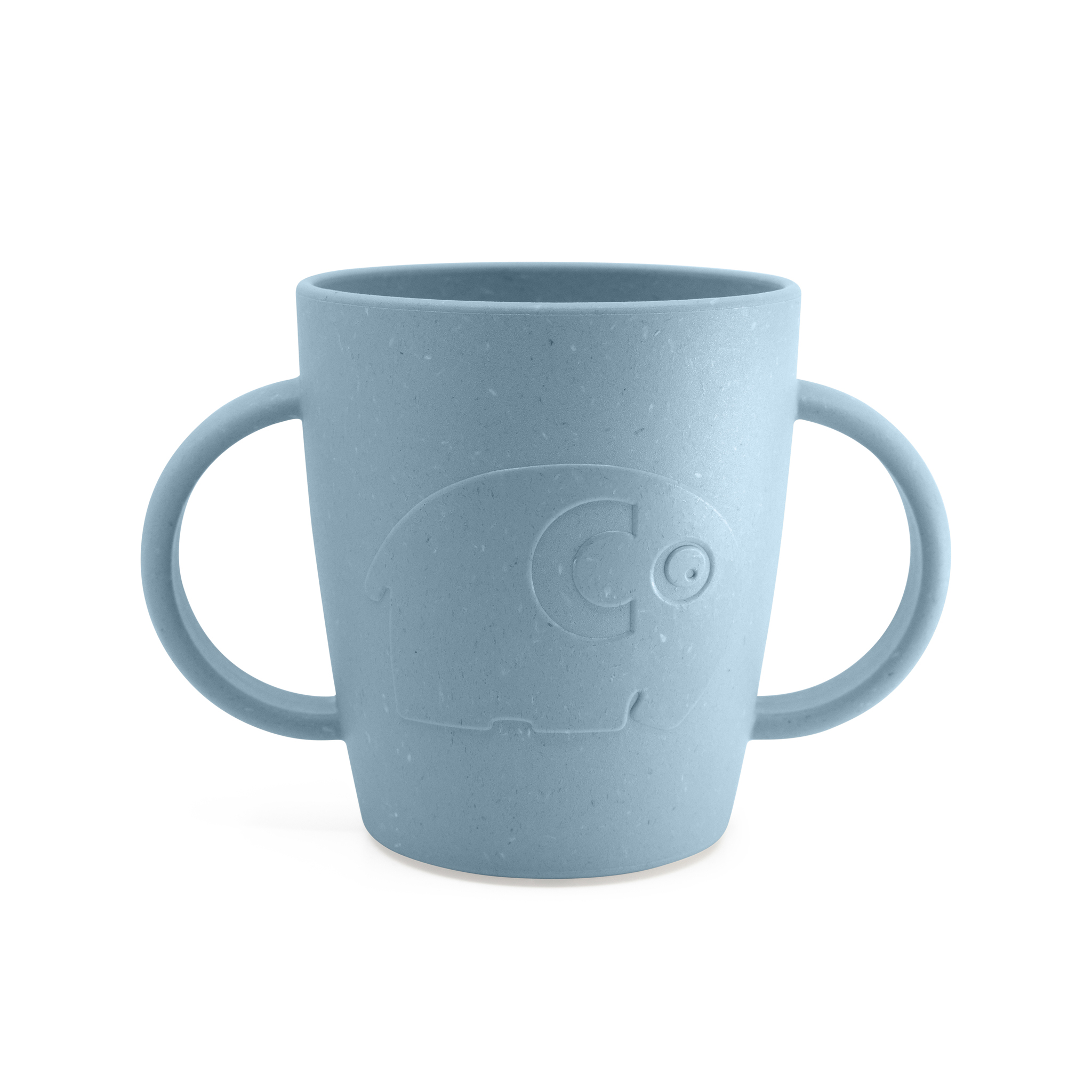 Die Babytasse mit Henkel ist Teil der Serie MUMS [ˈmɔmˀs], die in Dänemark aus Biokunststoff mit zugesetzten Holzfasern hergestellt wird. – Dies ist ein lebensmittelechtes Material mit einem im Vergleich zu einem rein fossilbasierten Kunststoff geringeren CO2-Fußabdruck.
