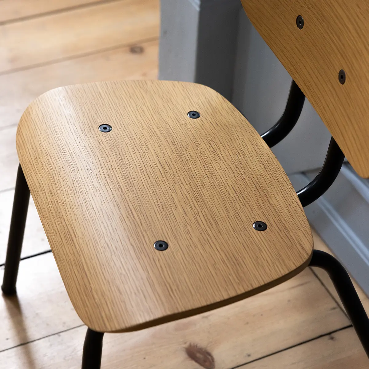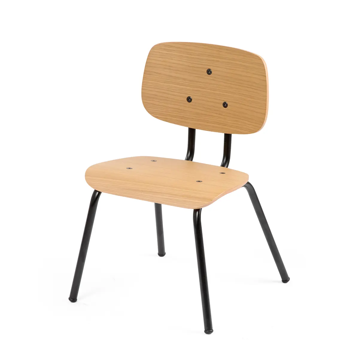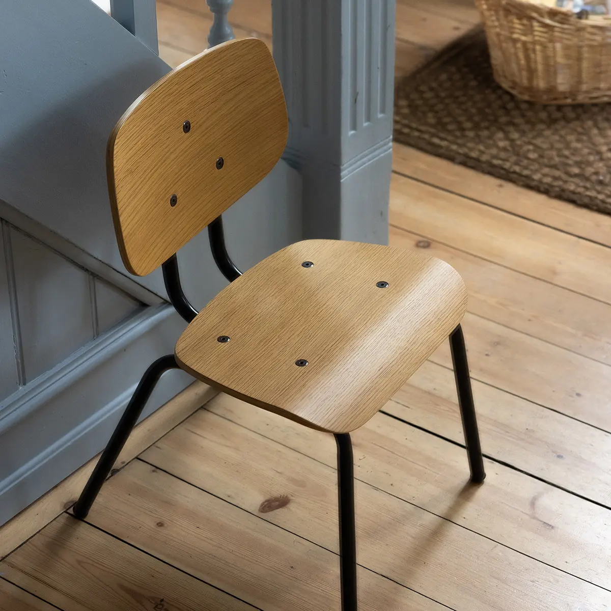 Beim Sebra Oakee Stuhl handelt es sich um einen kleinen, hübschen und minimalistischen Kinderstuhl, der zum Oakee Tisch und der Oakee Bank aus der gleichen Serie passt. Der Sebra Oakee Stuhl verfügt über vier pulverbeschichtete Metallbeine in mattem Schwarz und einen schönen Sitz und eine Rückenlehne in Eichenfurnier. Der Stuhl hat abgerundete Ecken und ist ideal für das Kinderzimmer, er eignet sich aber auch gut für den Eingangsbereich oder einen anderen Raum des Zuhauses.