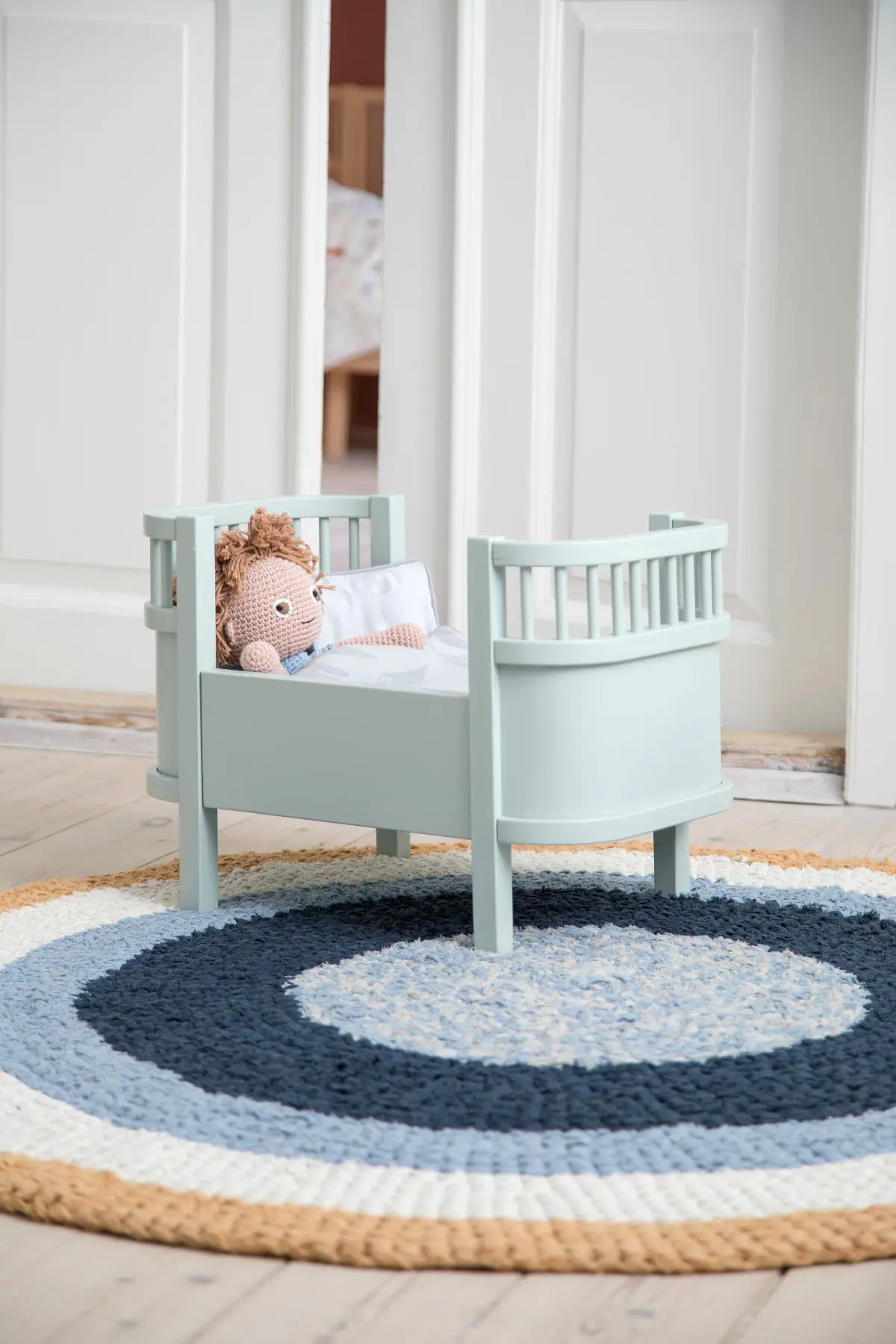 Das Sebra Puppenbett orientiert sich in Proportionen und Gestaltung am bekannten Sebra Bett Baby & Jr. Typisch sind die sanft gerundeten Ecken und die charakteristischen Bettenden mit Gitterstruktur. Dadurch entsteht ein besonders harmonischer und zeitloser Look, der perfekt in ein stilvoll eingerichtetes Kinderzimmer passt.