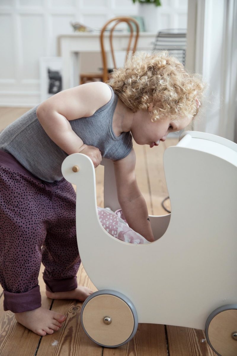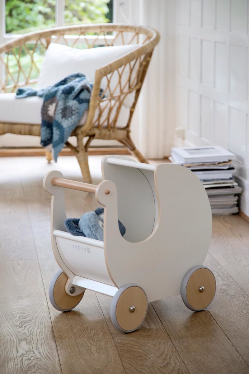 Der Sebra Puppenwagen verfügt über abgerundete Ecken und einen hübschen kleinen Naturholzgriff, den das Kind umfassen kann. Der Puppenwagen ist mit vier Holzrädern mit Gummikanten ausgestattet, dank denen er geräuscharm ist, wenn er über den Boden gefahren wird.