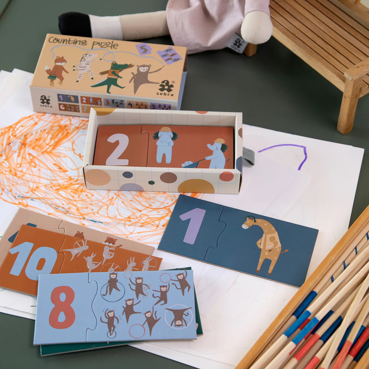 Dieses Sebra Puzzle mit Zahlen besteht aus 20 Teilen, die zu 10 kleinen Puzzles zusammengesetzt werden können