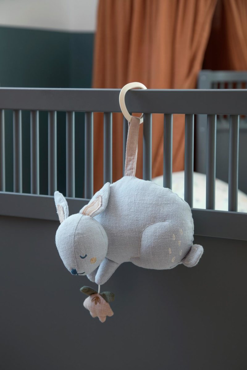 Die Musikspieluhr ist mit einem Band mit C-Ring ausgestattet, damit es leicht am Bett, dem Aktivitätsrahmen oder dem Autositz angebracht werden kann – oder an einem anderen Ort, an dem sie nützlich sein kann. Eine Spieluhr kann zu einem beruhigenden Schlafritual beitragen, das für ein Gefühl der Geborgenheit sorgt. Ein Schlafritual, dank dem das Kind auf ruhige Weise einschlafen und nachvollziehen kann, dass mit den Klängen von Bluebell der Tag endet. Die Spieluhr kann auch gut mitgenommen werden, wenn das Kind an einem anderen Ort schläft, um zur Schlafenszeit eine vertraute Melodie zu hören.