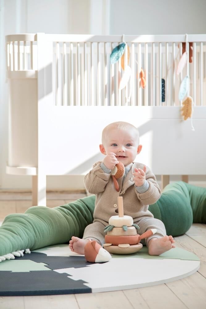 Sparky der Fuchs ist perfekt dafür geeignet, die fein- und die grobmotorischen Fähigkeiten zu fördern. Das Spielzeug besteht aus sechs Teilen – einem Holzsockel mit biegbarem Stab, vier Stapelringen mit verschiedenen Texturen, die untersucht werden können, und einer Spitze mit Glocke, die über die Form des Fuchskopfes verfügt. Wenn das Stehaufmännchen angestoßen wird, macht er lustige Bewegungen. Kleine Kinder werden es lieben, die Ringe zu stapeln – um sie dann wieder zu entfernen … immer und immer wieder. Das Aktivitätsspielzeug ist mit zwei Beißringen aus Kunststoff ausgestattet, die selbstverständlich frei von BPA, Phthalaten, PFOA, PFOS und Formamid sind. Darüber hinaus ist oben am größten Ring ein sicherer Babyaktivitätsspiegel angebracht und der Fuchsschwanz ist mit Knisterpapier versehen.