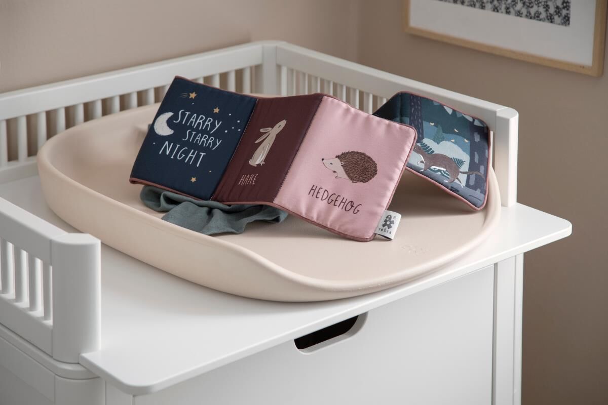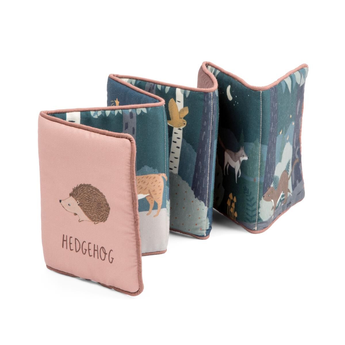 Schönes Sebra Stoffbuch Nightfall mit 14 „Seiten“ – gefüllt mit Illustrationen, die dem Kind den nächtlichen Wald zeigen und ihm einige der Tiere der Nacht vorstellen. Auf der einen Seite des Stoffbuches befinden sich kleine Szenen/Geschichten und auf der anderen Seite niedliche Illustrationen u. a. von Twinkle dem Igel und Woody dem Bären sowie der Text „Starry starry night“. Unter jedem Tier steht dessen englischer Name. Das Stoffbuch kann nach Lust und Laune gewendet werden, es lässt sich aber auch „lesen“ oder kann in den Mund genommen werden.