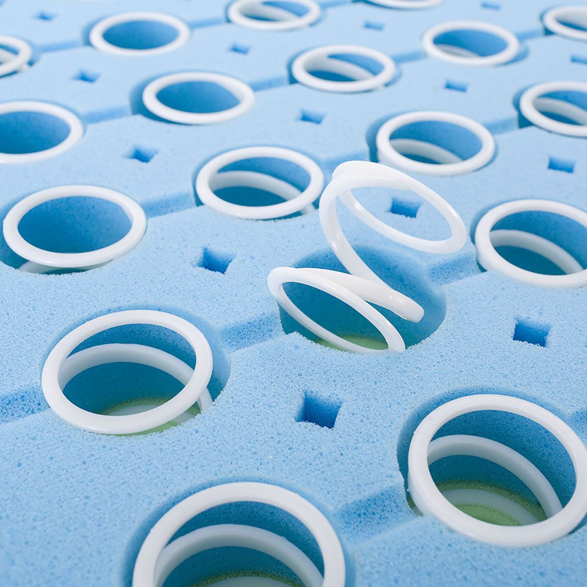 Spezialkunststofffedern stabilisieren dort wo Druck entsteht und sorgen so für ein einzigartiges Liegeverhalten, um die Wirbelsäule zu schützen. Sie sind komplett metallfrei – wie zahlreiche Untersuchungen belegen, sollte auf Metall im Schlafzimmer verzichtet werden, da das natürliche Erdmagnetfeld gestört werden kann.